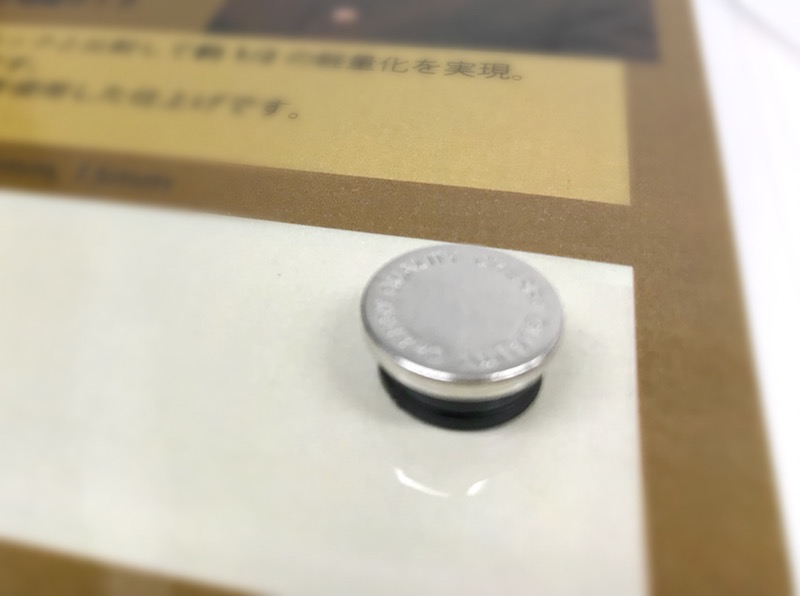 次にご紹介するのはこちら。これは薄い金属(真鍮)をプラスチックキャップの土台に巻いたもの。なので、これは見た目は完全な金属です。しかし、これでも金属ボタンに比べると半分の重さなんです。