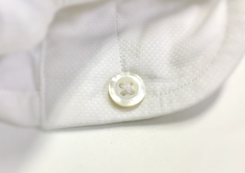 袖のボタンを見るとこんな白いボタンが付いています。これは貝が原料の貝ボタンですね。何の貝かは後でお知らせしますね。