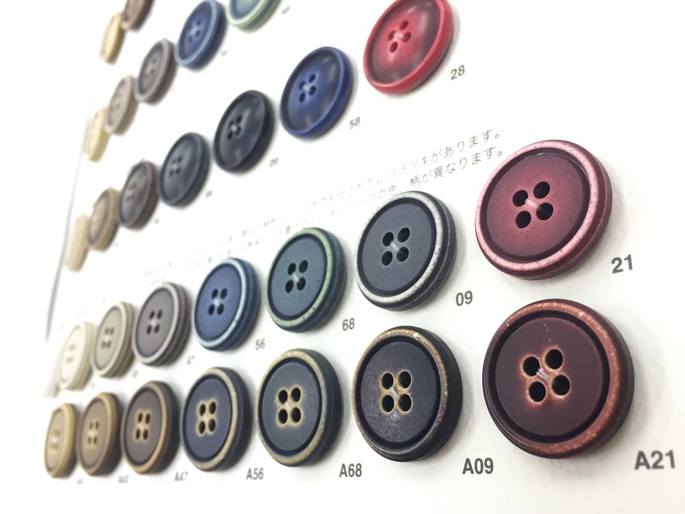 最近のカラーボタンが秘かに流行り始めています。ボタンもたかがボタンとしてとらえず、ファッション性を高める上で重要な要素ととらえてカラーボタンを採用してみてもらえると嬉しいです。