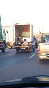 高速道路に乗ると荷台でゆっくり会話です。私もやってみたい気がしますが、ころげ落ちた事故起きた事ないのかね?渋滞でノロノロでしてましたが何時走り出すか解りません。