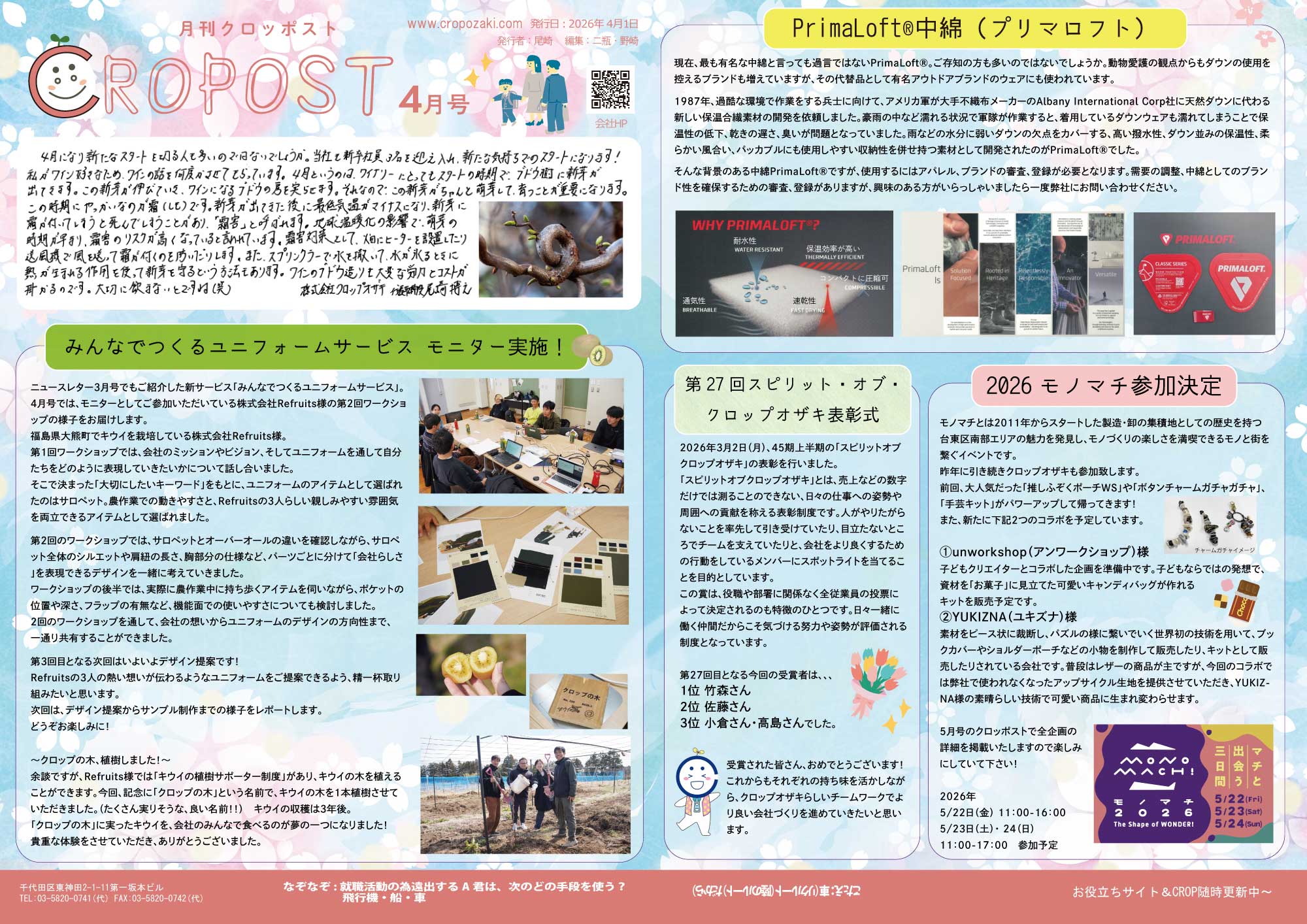 その他には、最も有名な中綿と言っても過言ではないPrimaLoft®のご紹介や、社員が選ぶ優秀社員の発表・2026モノマチ参加のお知らせを掲載しております。