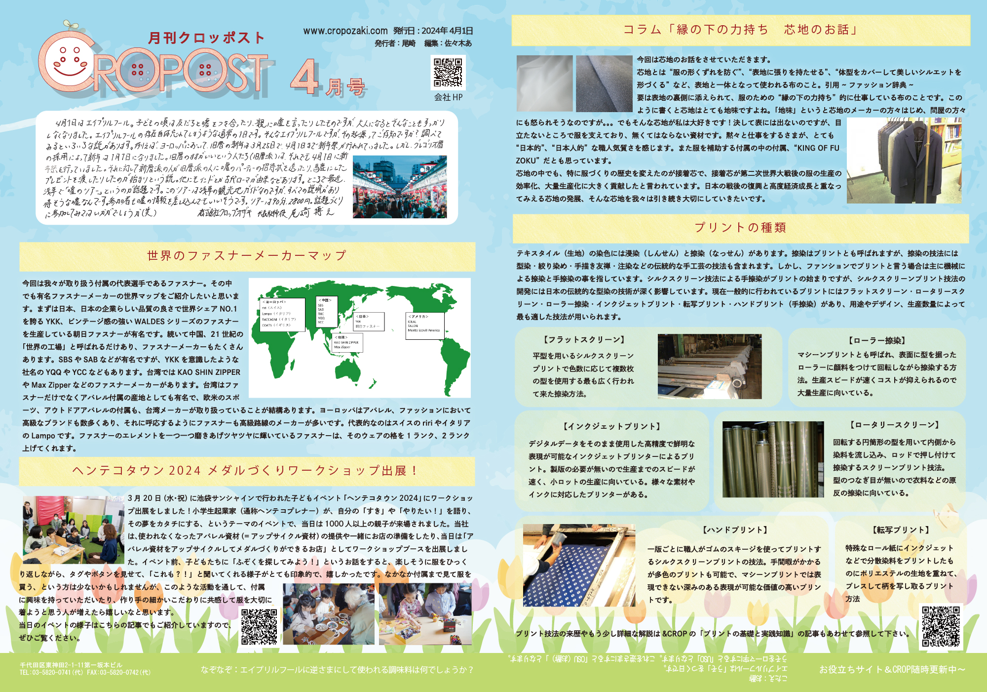他には芯地の紹介やプリントの種類の紹介、3/20に行われたイベントのレポートです。3/20に池袋のサンシャインシティ60Fで行われたヘンテコタウン2024にメダルワークショップを出展しました。たくさんの子供たちが参加してくれ、15分間という短い時間でしたが集中して1人1人素敵な作品を一生懸命作っていました。こちらはHPにも詳しいレポートを載せていますので、よろしければご覧ください。