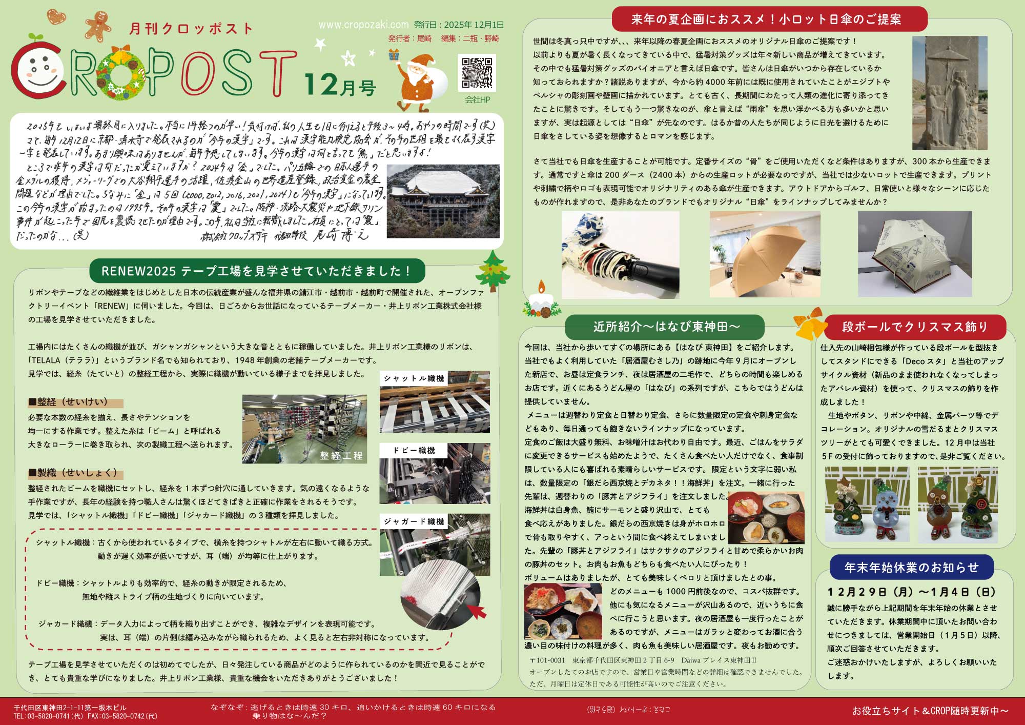 12月号のニュースレターは井上リボン工業株式会社様のオープンファクトリーの参加レポートや